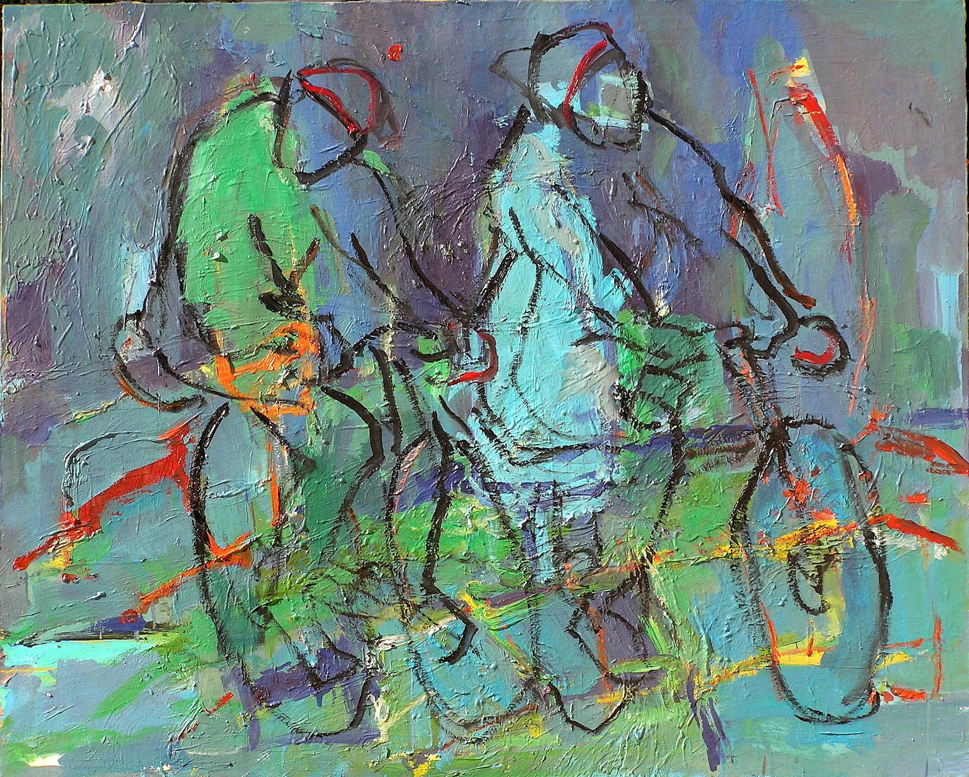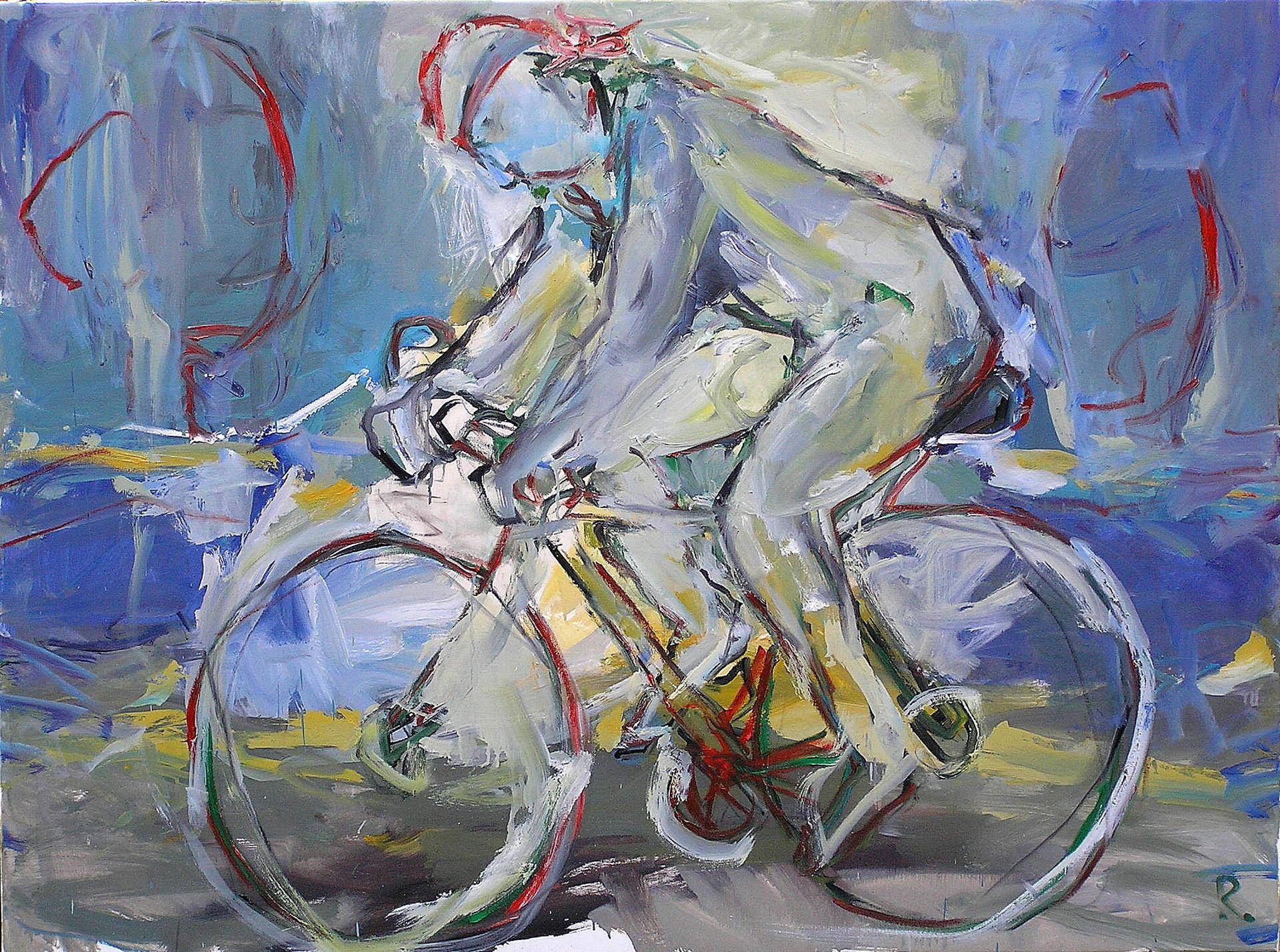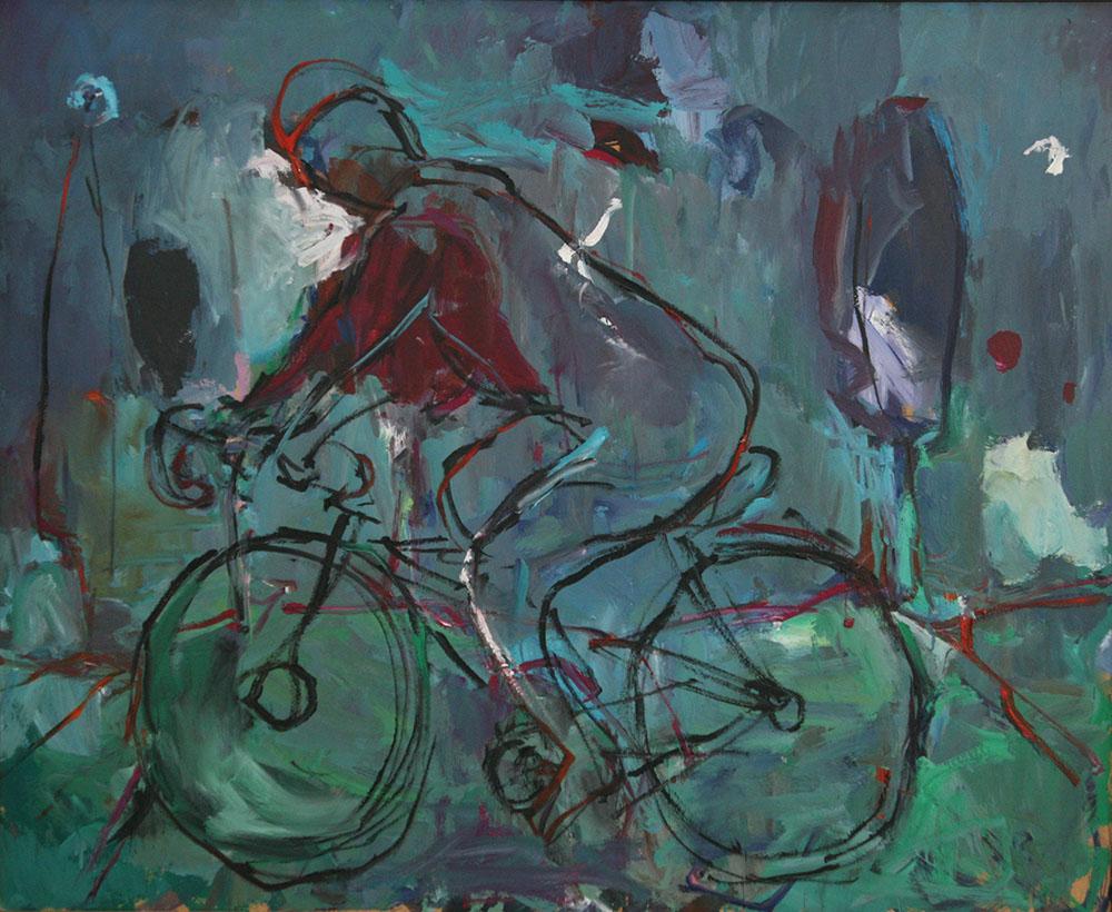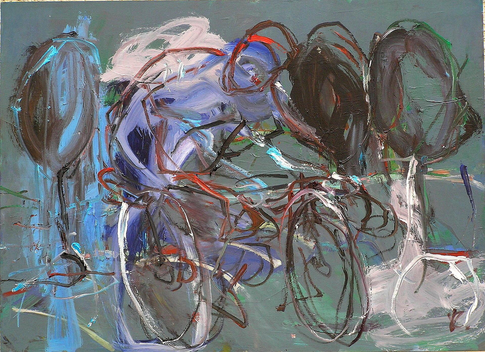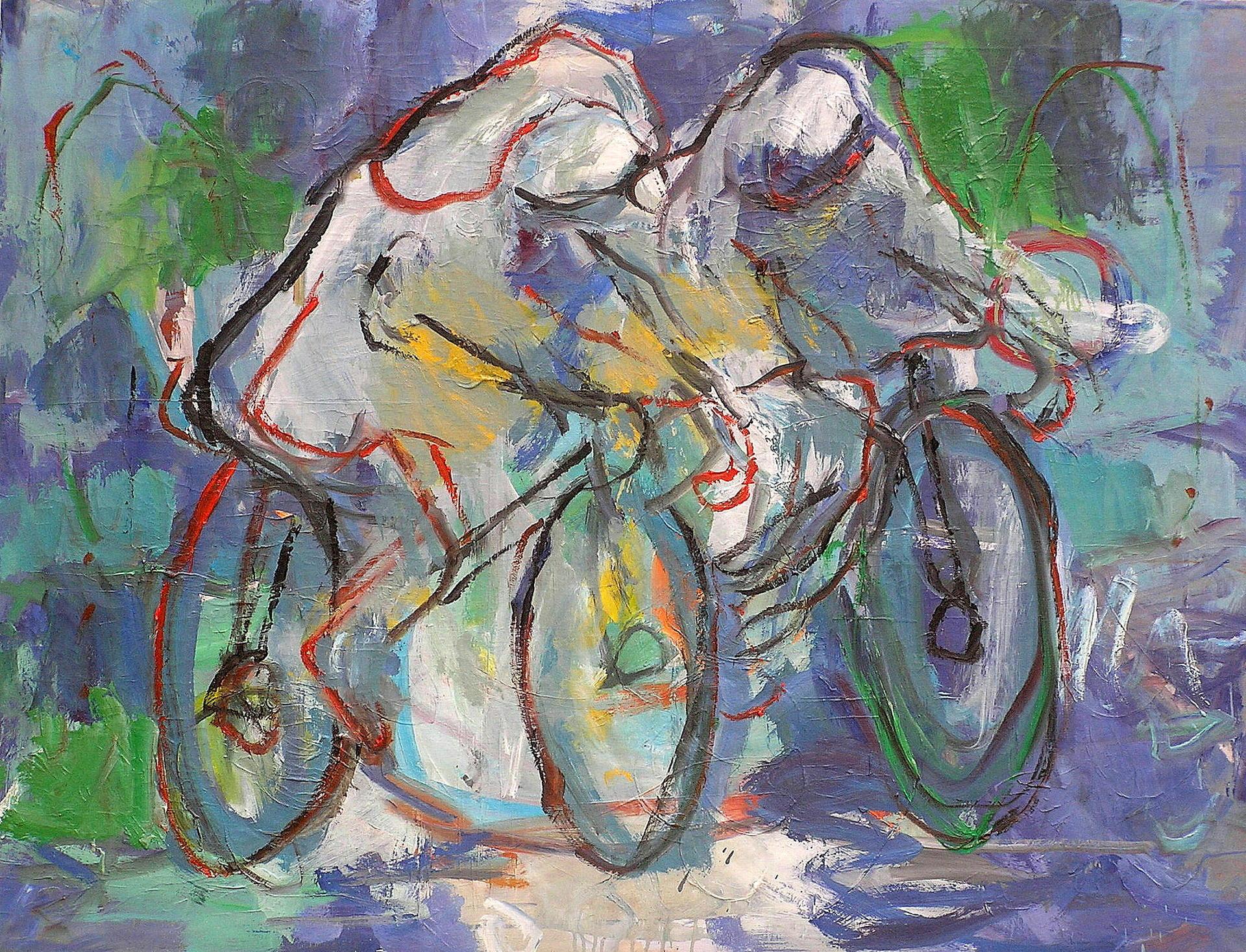 El espacio pictórico desestructura la realidad, la libera de su origen jerárquico confiriéndole agitación, impulso y participación al margen de la tradicional jerarquía fondo-figura. Convergen entre paisajes los Ciclistas, figuras que parecen paseantes del aire, en el que la mancha y la línea son el lenguaje del movimiento.