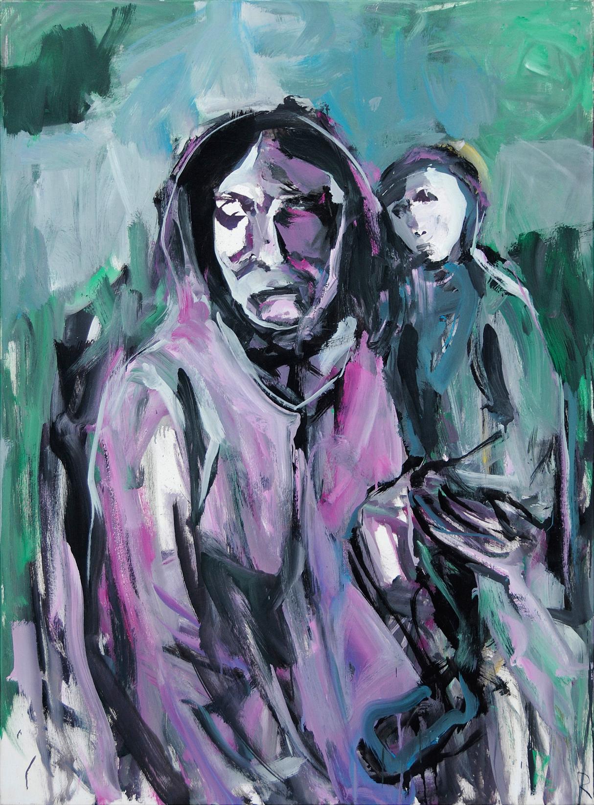 El pintor en su condición humana y social extrae la belleza del amor incondicional para presentarlo ante la injustica de los destinos inciertos, de los futuros denegados, de las necesarias huidas siempre asidas a una pequeña mano. Maternidades parte del respeto y la ternura con madres envejecidas, tensas, hieráticas, pero la evolución del cromatismo y la composición añade blancos lumínicos en una perfecta simbiosis de la tradición iconográfica de la Virgen con el Niño y una cargada intención social. Maternidades son instantes… escenas bellas de madres tristes.