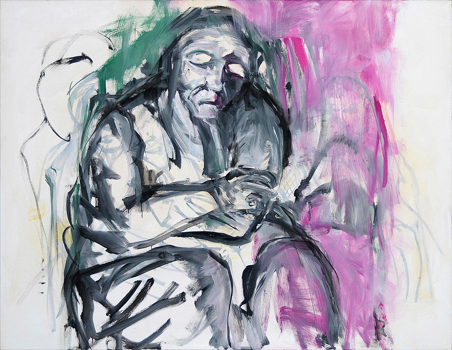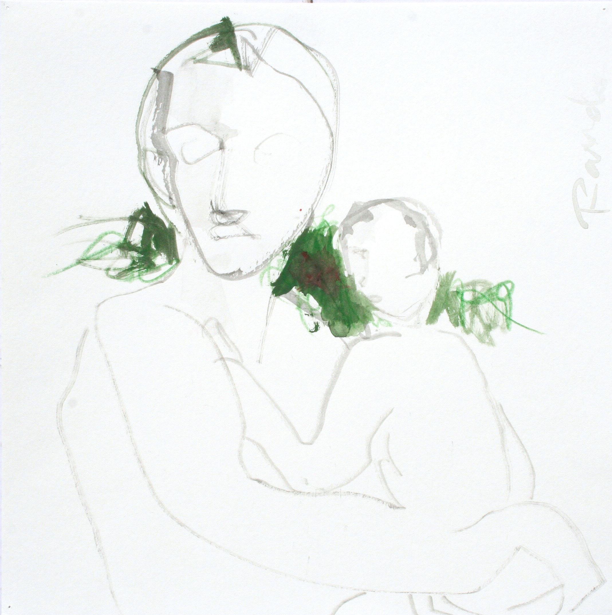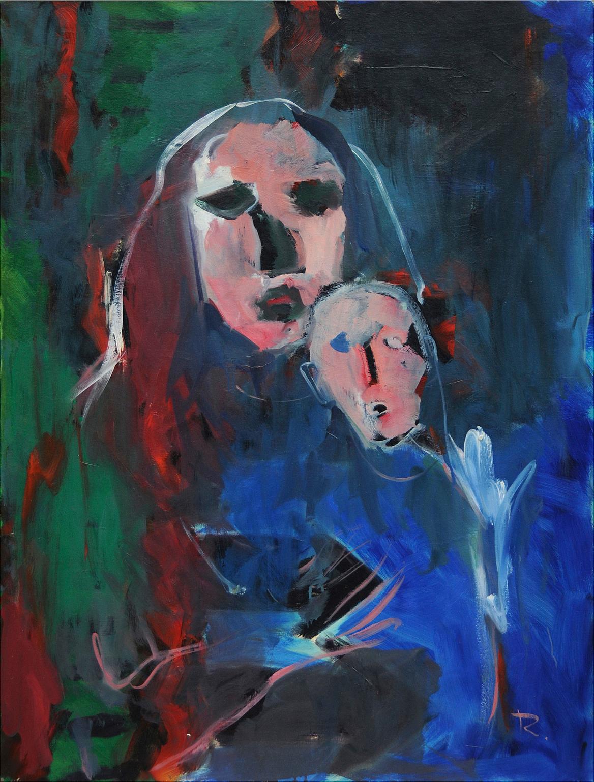 En la historia del arte las imágenes de la maternidad han sido lideradas por la idealización y condescendencia, no es el caso de Jorge Rando. Este lienzo, en el que aparece una mujer sentada, evoca a un innegable intimismo, sus rasgos son duros y envejecidos, los gruesos perfiles negros contrarrestan con el vacío de color ofreciendo a quien lo observa una profunda tristeza. Pinto el dolor porque quiero apelar al amor, ha confesado el maestro ante la dureza de sus temas.