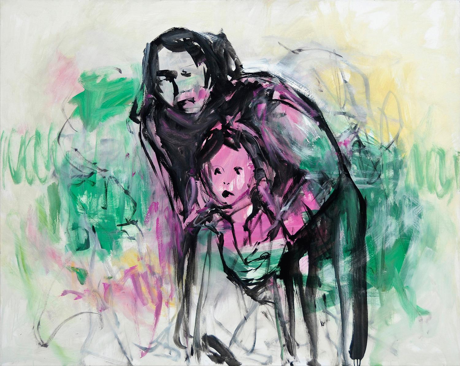 En esta obra el artista parece captar un momento, al igual que una fotografía, como si estuviese observando y plasmase una acción que dura un instante. El verde, el magenta y el negro luchan por ocupar su espacio. Esta obra de Maternidad no muestra un lado amable sino más bien una situación de alerta, mientras el niño observa con gesto de sorpresa y curiosidad a quien se encuentra al otro lado del lienzo, la madre rodea con su brazo el cuerpo de su hijo, en una actitud protectora, como evitando que se acerque a quien está observando.
