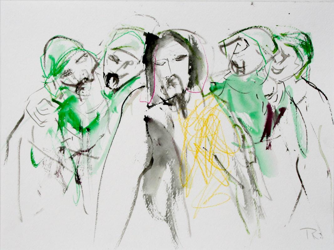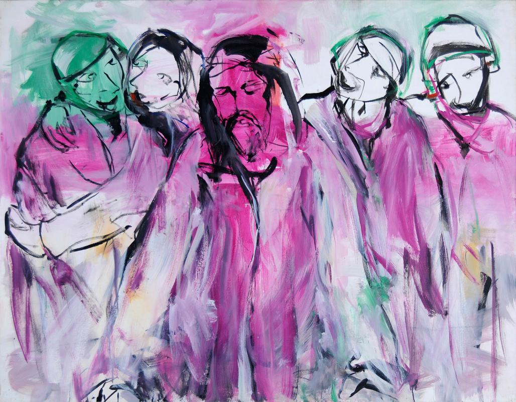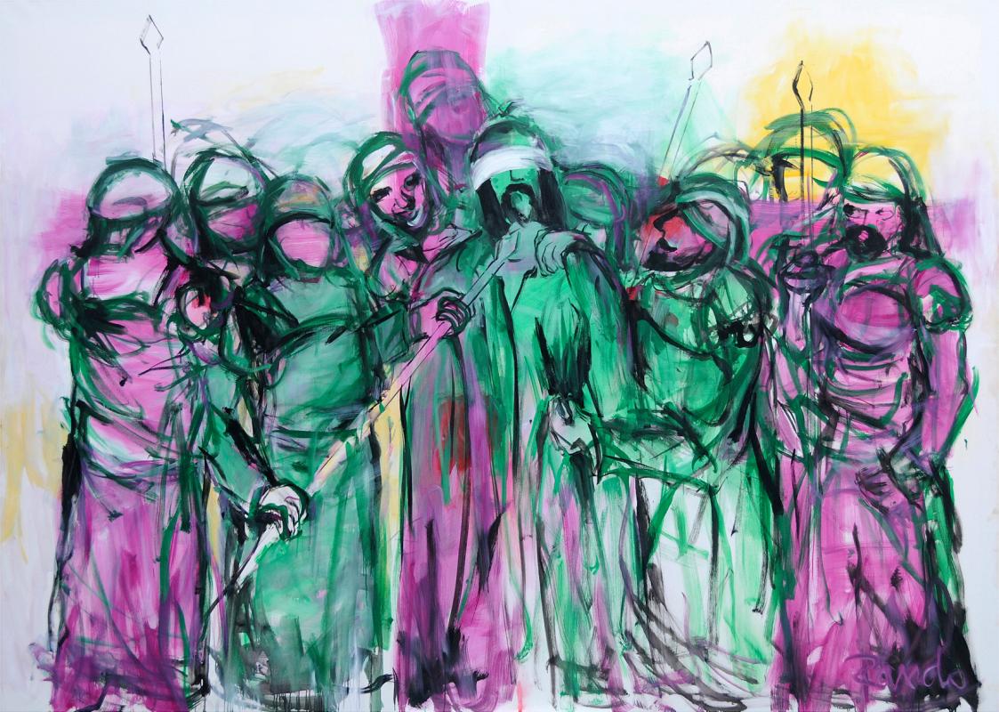 La Pasión narrada con el lenguaje del magenta, el verde, el amarillo y el negro. La Pasión del Jesucristo de ojos vendados y corona de espinos, del Jesús humillado y sufriente, del Jesús sometido al escarnio y la burla. Los espacios, en ocasiones regidos por una cruz magenta, señalan la escena. Jesús y Judas fundidos en el beso, los sayones que le vejan, una María Magdalena que le abraza. Este calvario conduce al artista a una lucha plástica entre la línea y la mancha, a un diálogo entre el dibujo y el color.