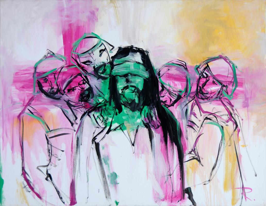 Año: 2005-2007Uno de los pasajes de la vida de Jesucristo, que más impresionó al artista desde su niñez, fue el escarnio al que fue sometido. El dibujo obtiene mayor importancia por medio de un trazado mínimo que evita detalles y da cuerpo. El maestro ha utilizado manchas verdes, amarillas y magentas. Sus verdugos lo observan con caras burlonas y grotescas, recordando a máscaras primitivas o emulando la expresión mínima del rostro humano. En el centro del cuadro, Cristo, con los ojos vendados, frente al observador, haciéndole partícipe de lo que está aconteciendo.