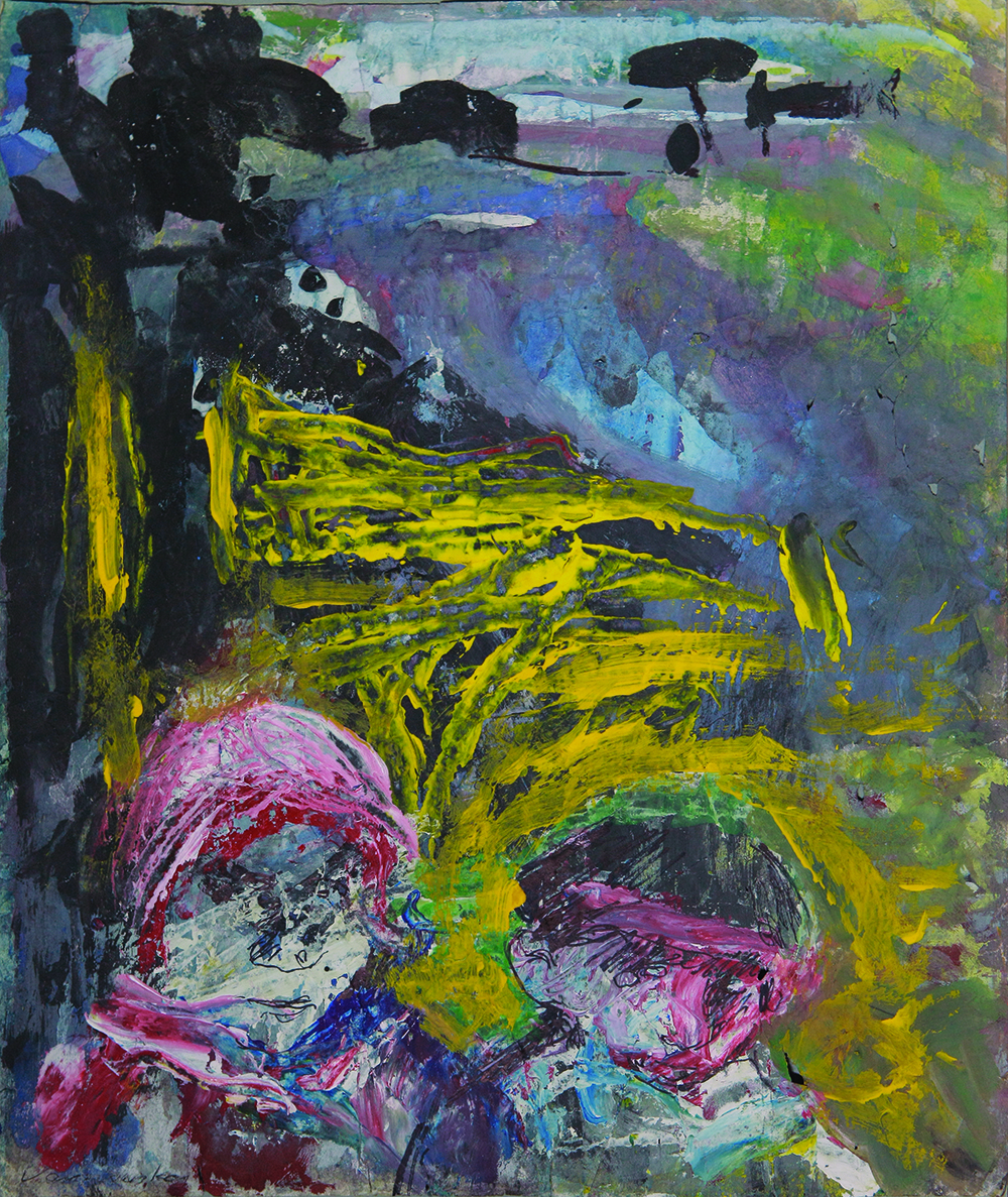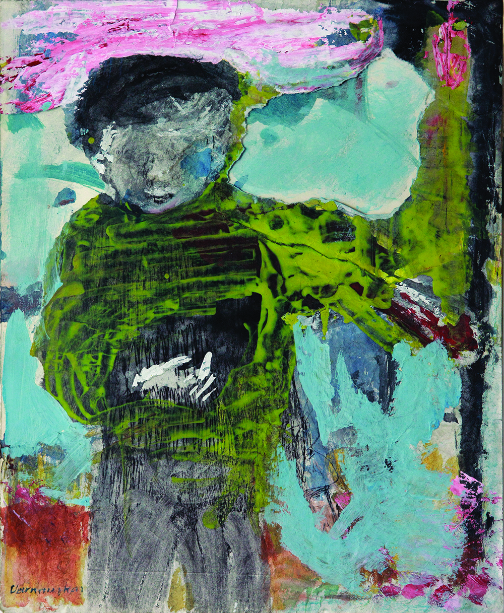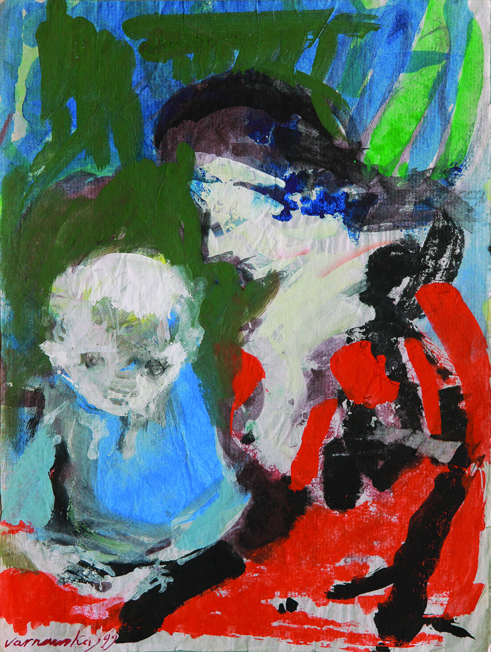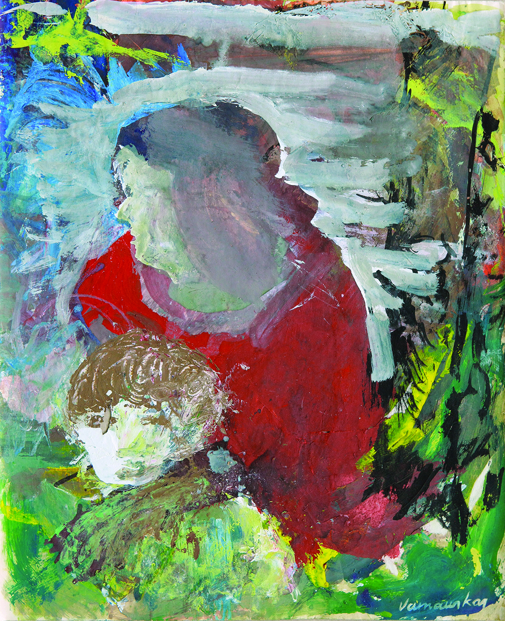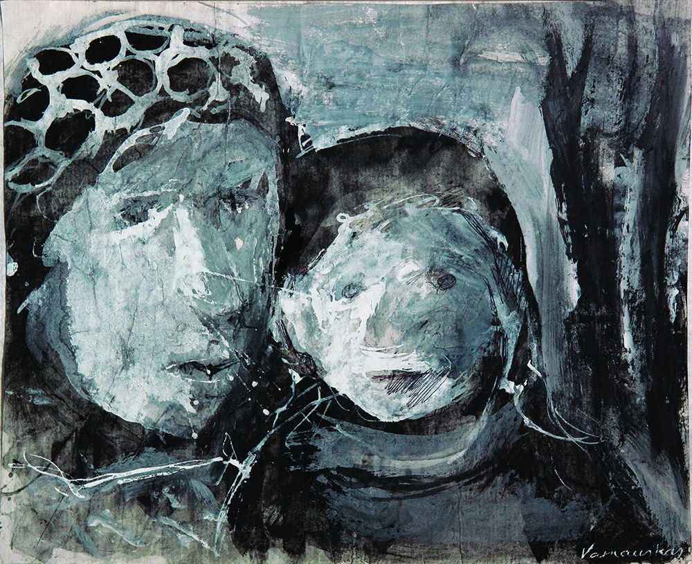 Al igual que las estatuas del arte popular, las imágenes de las Madonas se resucitan en la pintura de Varnauskas. La deformación expresiva, las líneas y los trazos resueltos los hacen ágiles. El drama indefinido tiene lugar en el espacio abstracto y expresivo del paisaje.