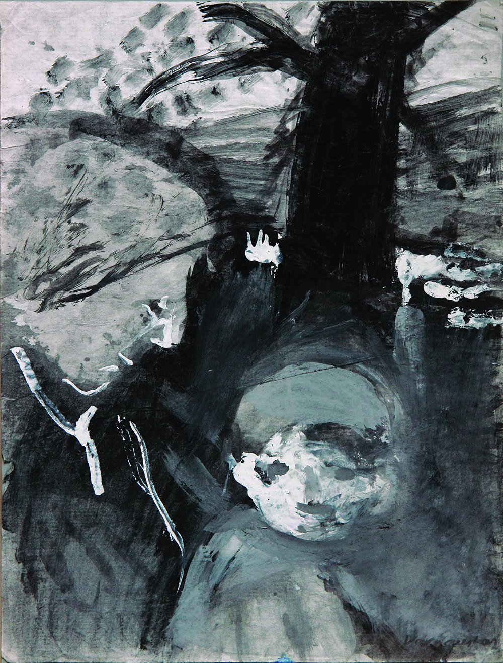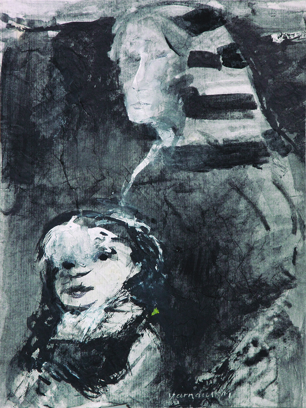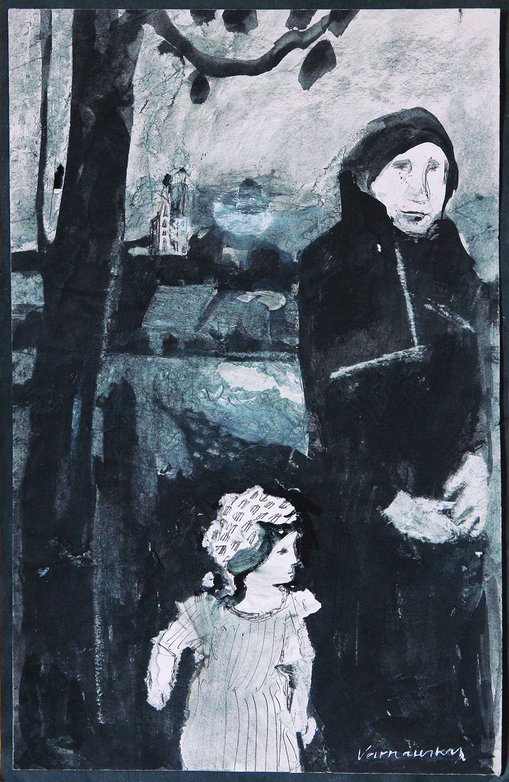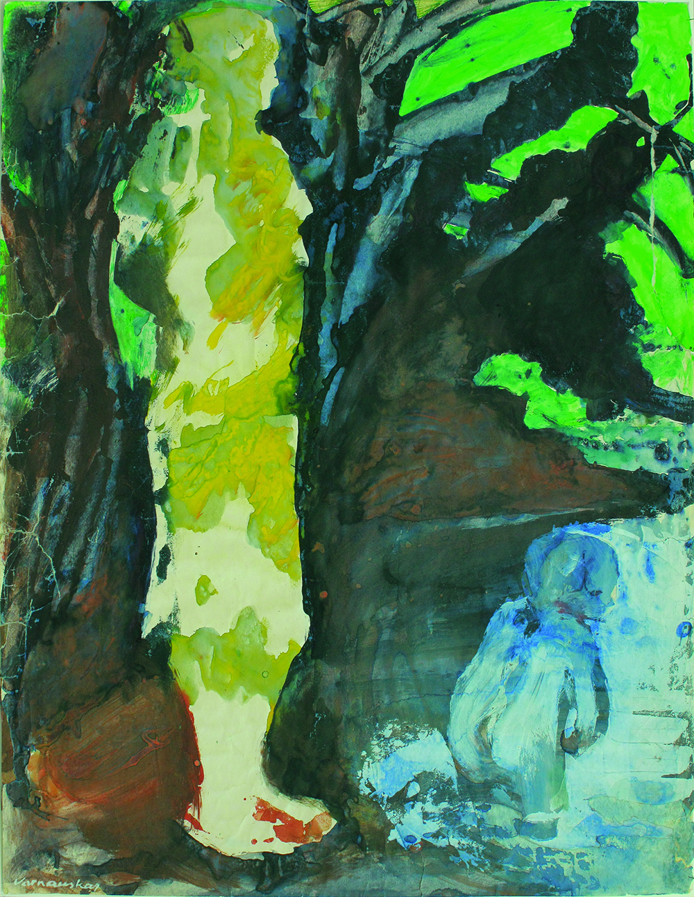 Al igual que las estatuas del arte popular, las imágenes de las Madonas se resucitan en la pintura de Varnauskas. La deformación expresiva, las líneas y los trazos resueltos los hacen ágiles. El drama indefinido tiene lugar en el espacio abstracto y expresivo del paisaje.